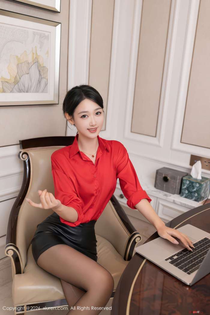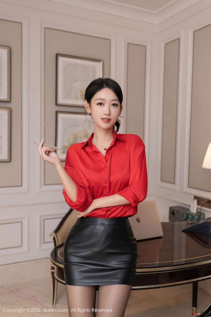 纵向延伸的线条在空间中交错,奠定了视觉基调。唐安琪身着红色衬衫与黑色皮裙,利落线条与丝袜光泽在暖调空间内完成冷暖平衡。约 80 张画面,收录了她不同角度下的魅力,材质本身也在诉说着微妙的故事。光线流淌于肌肤与服饰之间,捕捉着每一个瞬间,呈现出一种克制的性感。